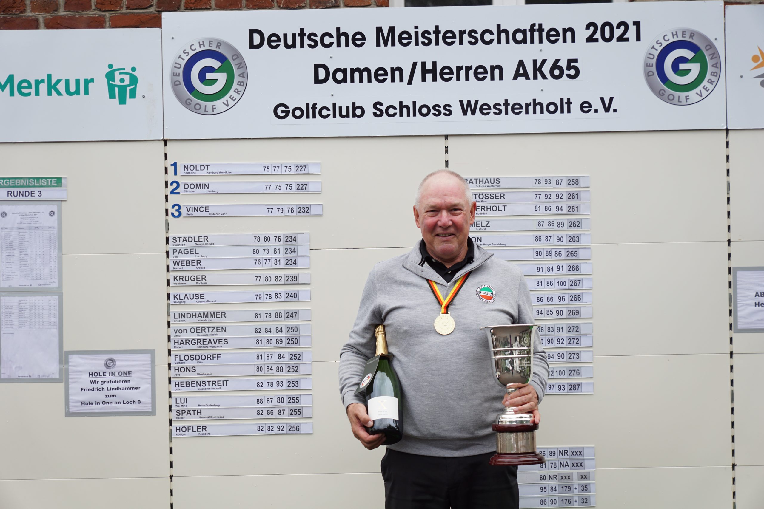 Erstmals seit 2018 heißt der Deutsche Meister der Altersklasse (AK) 65 nicht Christoph Städler: Karlheinz Noldt vom GC Hamburg Wendlohe konnte die Deutsche Meisterschaft (DM) seiner Altersklasse, die vom 1.-3. Oktober 2021 im GC Schloss Westerholt ausgespielt wurde, für sich entscheiden.