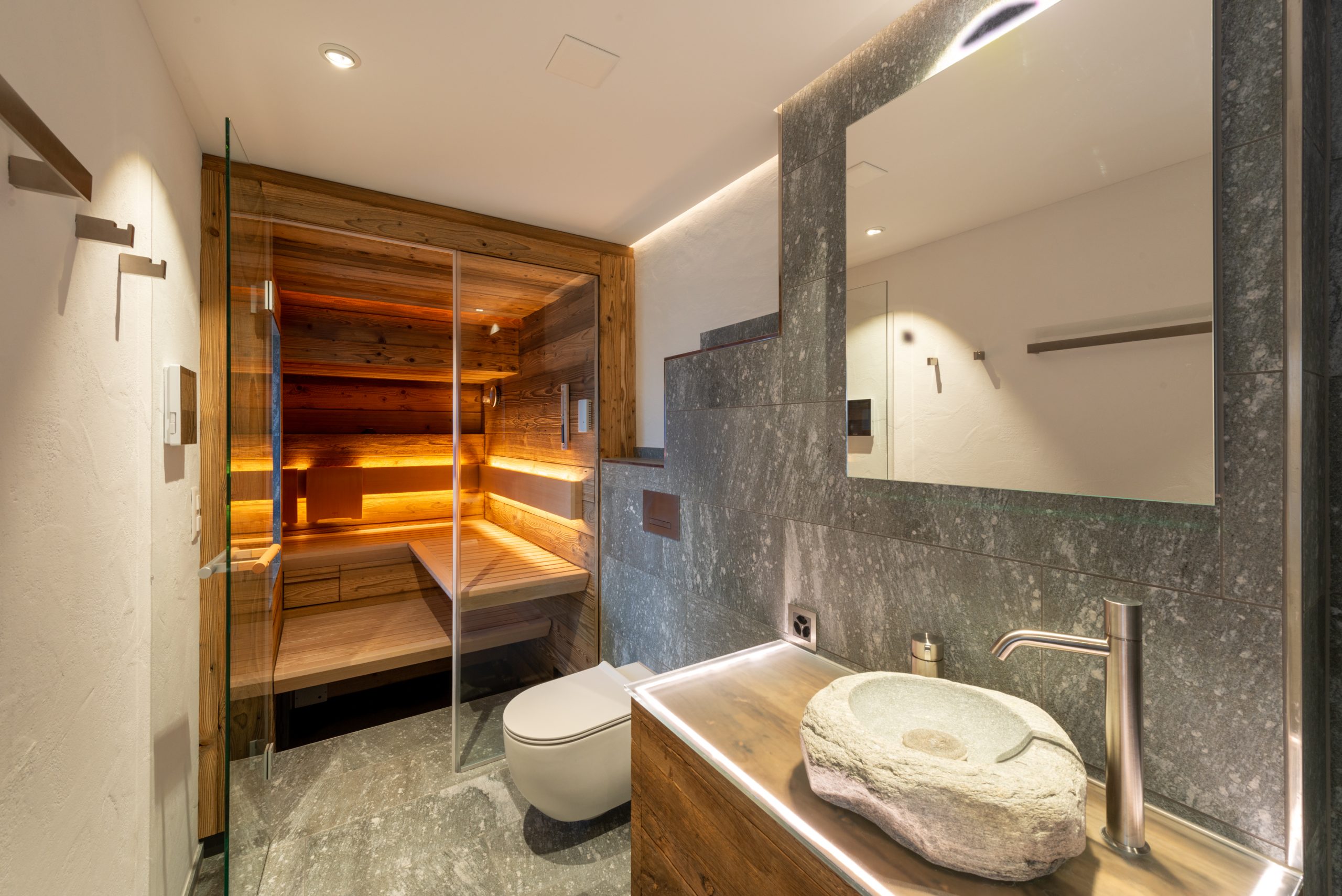 Das Highlight des neu gestalteten Badzimmers ist die maßgeschneiderte Sauna CASENA von KLAFS. Mit ihrer freischwebenden Winkelliege und der integrierten Glasfront zieht die CASENA zu Recht alle Blicke auf sich. Mit der rustikalen Holzwahl des „sonnenverbrannten Altholzes“ und der großzügigen Glasfront wurde eine perfekte Balance zwischen Tradition und Moderne gefunden. Das lebhaft gezeichnete Holz wird von den klaren Linien reizvoll kontrastiert. Und die dimmbare Rückenlehnen-Beleuchtung SUNSET vermittelt eine angenehme, intime Stimmung während des Saunierens.