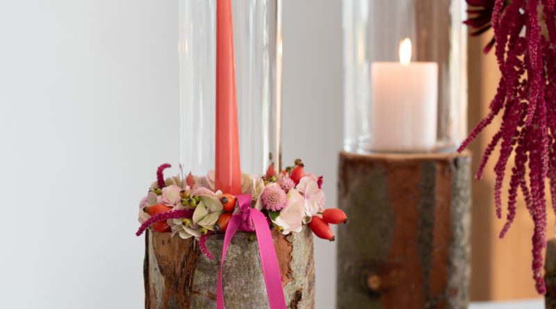 5. Glas einsetzen – wahlweise als Vase mit Blumen oder als Windlicht mit Kerze dekorieren.